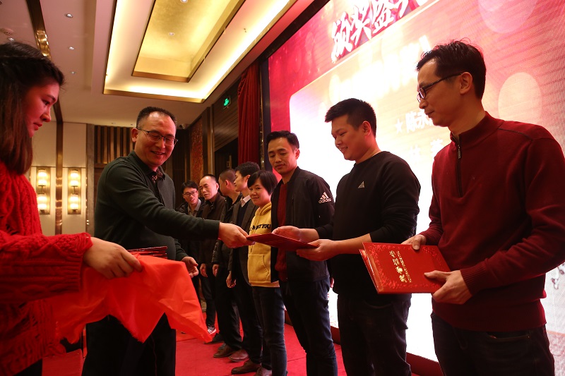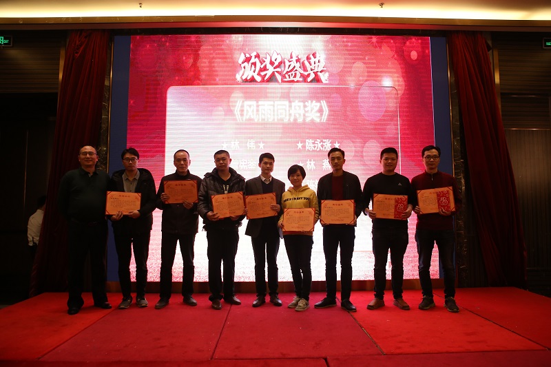 年會伊始,率先進行了“風雨同舟獎”頒獎。在溫情的音樂聲中,公司總經理林榮強一一向臺上8位過去為公司默默奉獻十年光陰的員工們頒發獎狀及5000元現金紅包,并親切地握手對他們多年堅守崗位所付出的努力與貢獻致以最衷心地感謝。