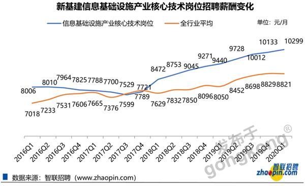 2020年一季度,信息基礎設施產業核心技術崗位的平均招聘薪酬為10299/月,比全行業平均(8821/月)高16.75%5G 及人工智能崗位薪資更優。信息科學技術、計算機科學與技術專業畢業生當前收入最高,在萬元以上。